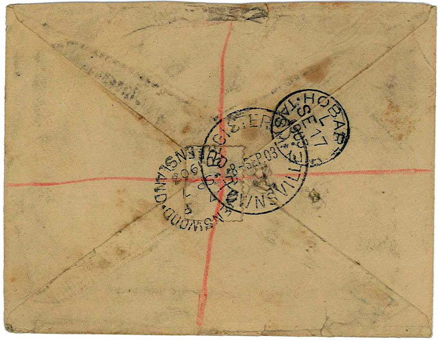 Townsville Registered Label in red rated 3R with a Townsville registered datestamp type 3 on a Sideface rated 3R and dated 1913. Seen at Status auctions